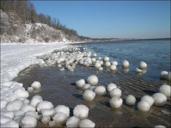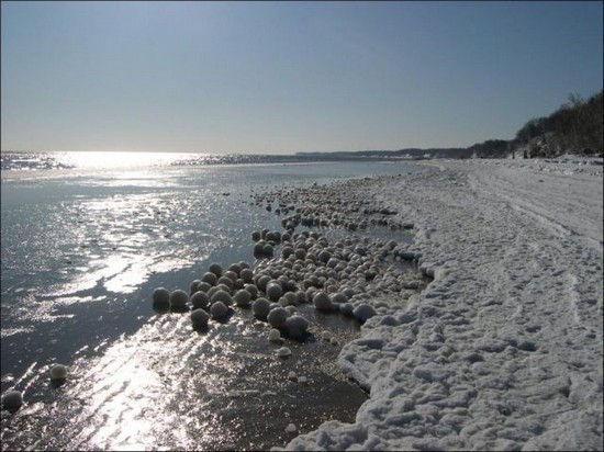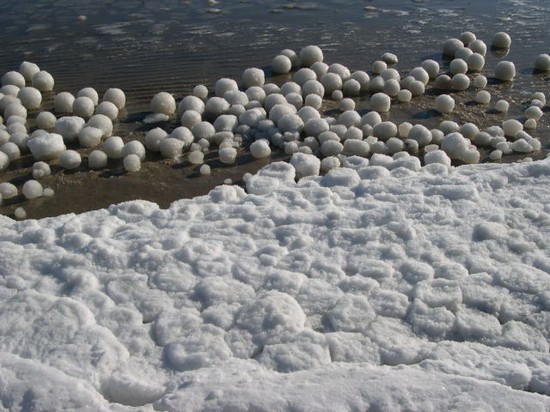 Được biết sự thay đổi nhiệt độ dưới tầng băng và nước là nguyên nhân gây ra hiện tượng độc đáo này. Những quả bóng tuyết nhìn từ xa có vẻ kì lạ như rất nhiều viên ngọc trai khổng lồ.