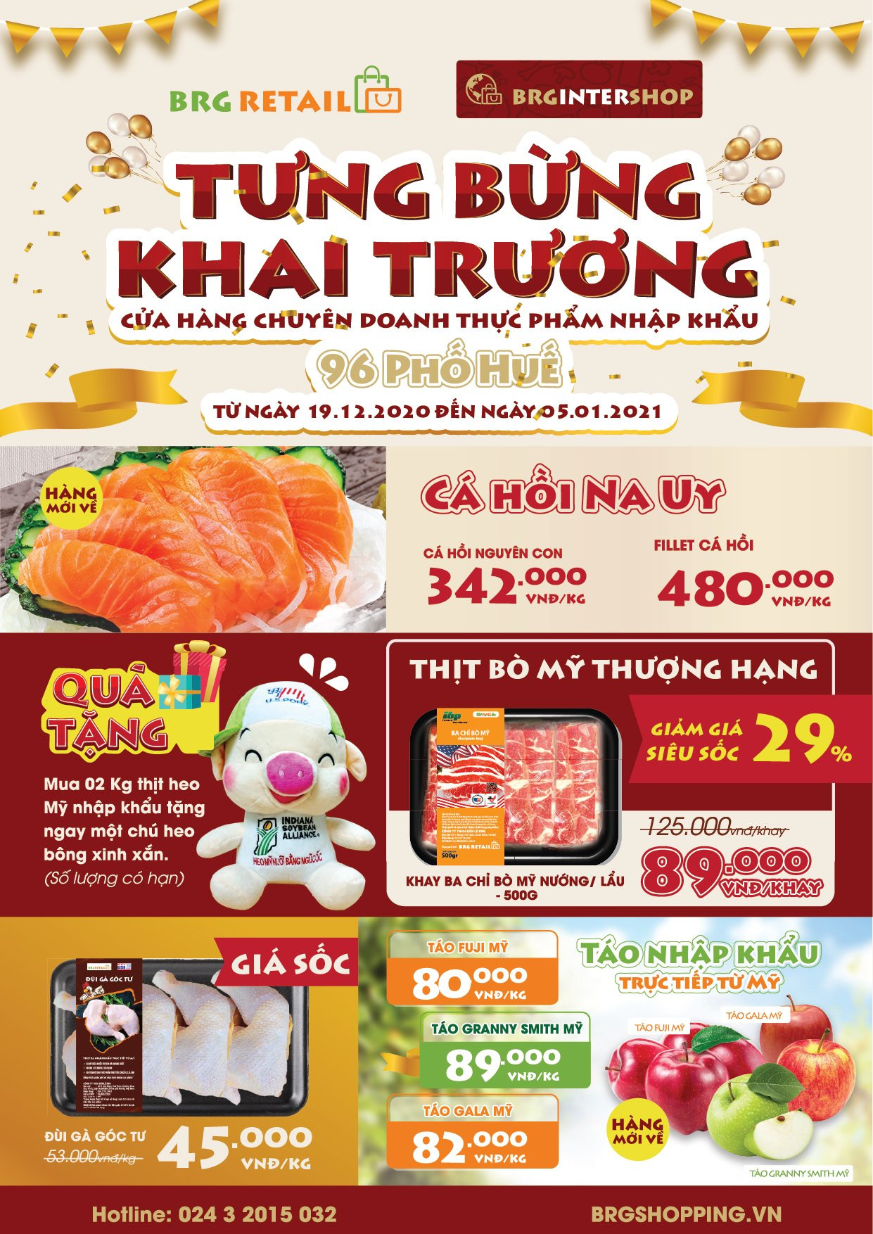 Ngày 19/12/2020, cửa hàng BRGIntershop đầu tiên tại địa chỉ 96 Phố Huế, Hà Nội chính thức khai trương và đi vào hoạt động. Nhân dịp khai trương cửa hàng BRGIntershop đầu tiên, quý khách mua hàng từ ngày 19/12/2020 đến 05/01/2021 sẽ được hưởng hàng loạt chương trình khuyến mại hấp dẫn như: Tặng 1 chú heo bông xinh xắn khi mua 2kg thịt heo Mỹ, Thịt bò ba chỉ Mỹ giảm giá còn 89.000đ/khay 500gram, Cá Hồi Na-uy nguyên con chỉ còn 342.000đ/kg, Táo Fuji – 80.000đ/kg…