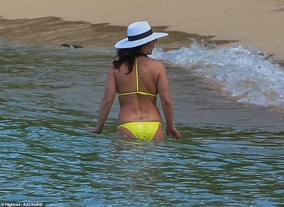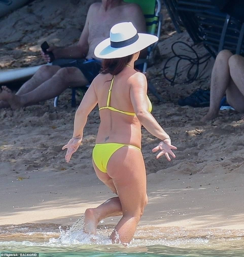 Nữ ca sĩ diện bikini màu vàng neon lộ thân hình béo ú xồ xề, bụng mỡ và đùi thô kém săn chắc dù tập thể thao nghiêm ngặt từ nhiều năm nay.