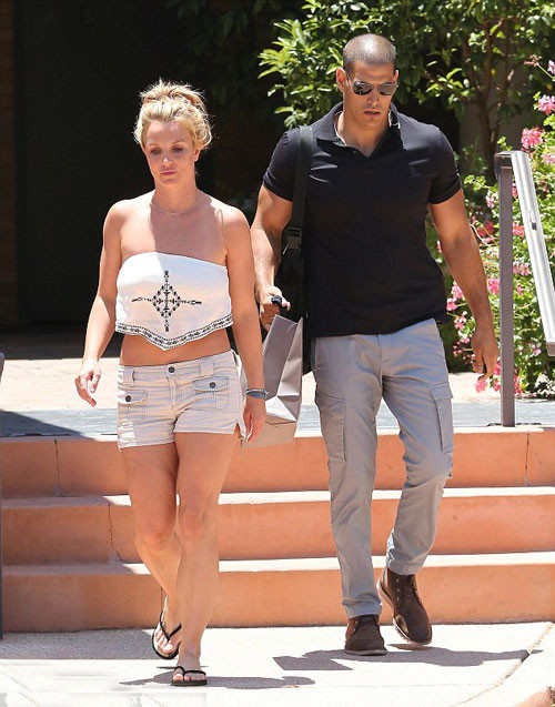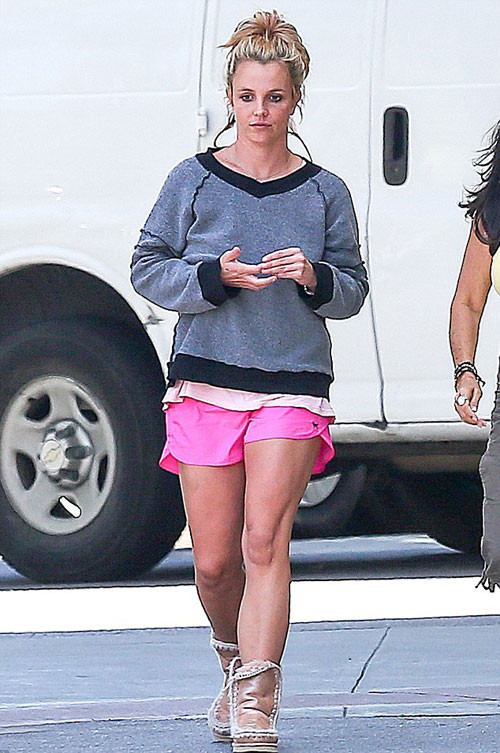 Britney nổi tiếng là ăn mặc lôi thôi, thiếu gu thẩm mỹ. Một ngày trước đó, bà mẹ hai con mặc quần short hồng và áo nỉ chẳng hề ăn nhập khi đi chơi với bạn trai. Cô cũng để mặt mộc và cột tóc lòa xòa.