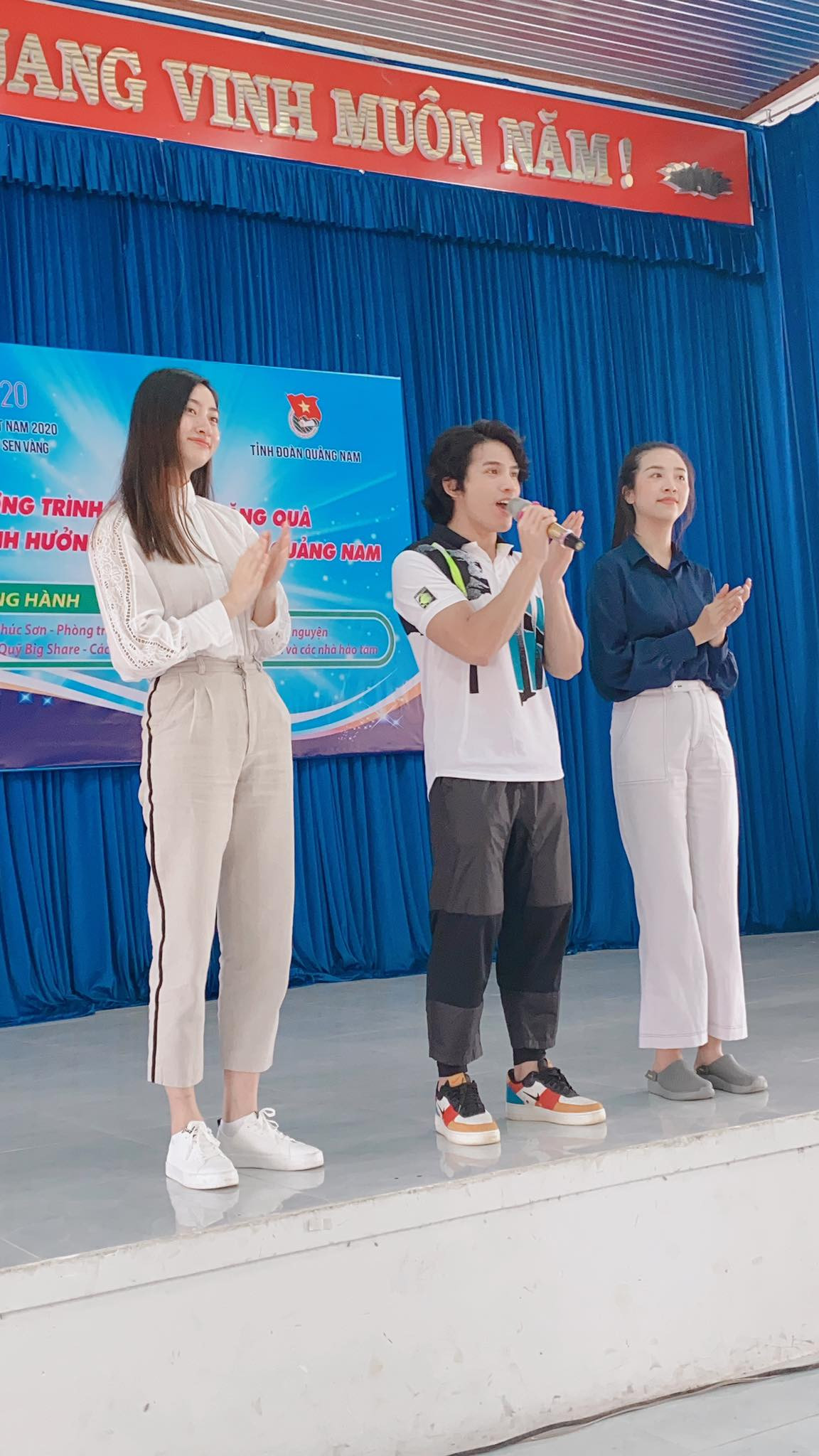 Đồng hành cùng đoàn từ thiện, nam ca sĩ Quốc Thiên đã gửi tới bà con những giai điệu lạc quan để cổ vũ tinh thần của họ. Hai nàng hậu Lương Thuỳ Linh và Thuý An cũng không ngần ngại khoe giọng và cổ vũ anh trong tiết mục này.