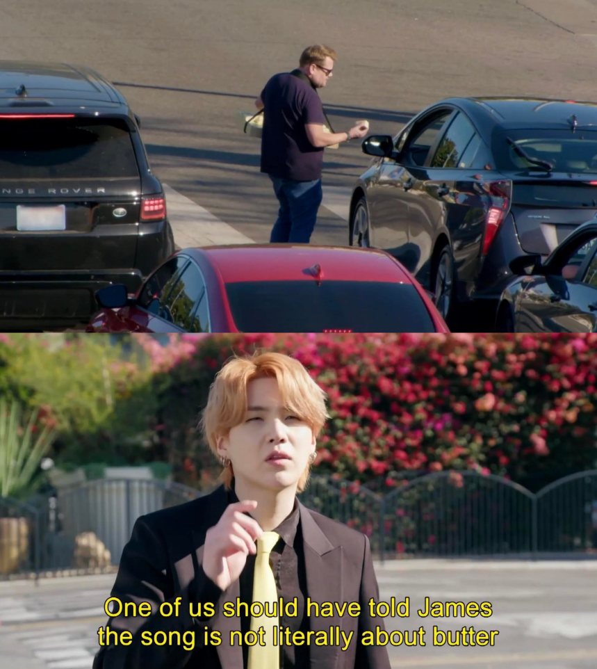 "Bơ (Butter) đây! Bơ của BTS. Ai mua bơ của BTS không nào! Giá 100 đô. j-hope tự làm đó", màn rao bơ này khiến fan được dịp cười nghiêng ngả với sự lầy lội từ MC James, nhưng SUGA - người thuộc "phái thực tế" của BTS lại lắc đầu: “Ai đó nói với anh ấy là Butter của BTS không có nói gì về bơ được không?”.
