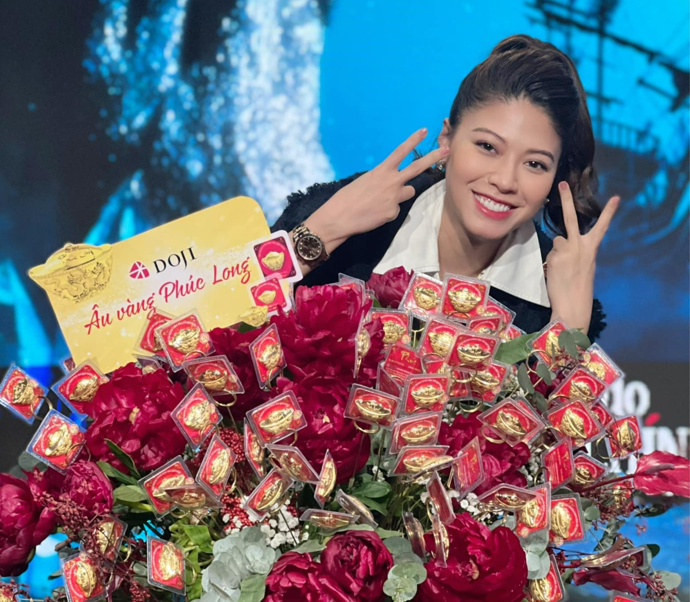 Trong show Money talk, BTV Ngọc Trinh xuất hiện cùng bó hoa 100 lượng vàng thật. Theo đó, nữ BTV cho biết cũng hi vọng được sở hữu một bó hoa trị giá "100 lượng vàng" từng gây xôn xao trên mạng vào 8/3 vừa qua.