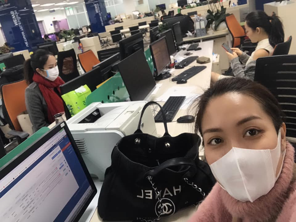 BTV Hoàng Trang chia sẻ ảnh bịt khẩu trang khi đi làm và viết: “Những con ong chăm chỉ vẫn miệt mài cày mùa virus corona, và khẩu trang đúng quy cách để phòng dịch “.