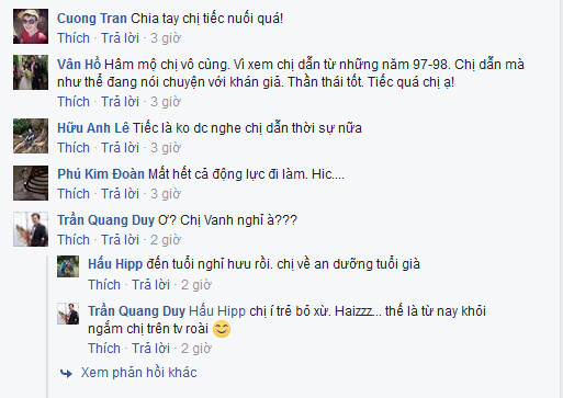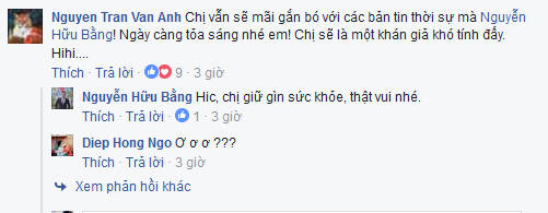 Bản thân BTV Vân Anh ngầm xác nhận sự việc thông qua bình luận: “Chị vẫn sẽ mãi gắn bó với các bản tin thời sự mà. Chị sẽ là một khán giả khó tính đấy”. Bên cạnh đó, BTV Vân Anh không quên gửi lời động viên tới đàn em là BTV Hữu Bằng.
