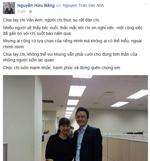 Anh viết: Chia tay chị Vân Anh, người chị thực sự rất đàn chị. Nhiều người sẽ thấy tiếc nuối, thắc mắc khi chị xin nghỉ việc, một công việc đã gắn bó với chị suốt bao năm qua. Nhưng ai cũng có lựa chọn của riêng mình mà không ai có thể hiểu, ngoài chính mình. Chia tay chị, không thể vui nhưng vẫn phải cười cho đúng tinh thần của những người luôn lạc quan. Chúc chị luôn mạnh khỏe, hạnh phúc và đừng quên chúng em”.
