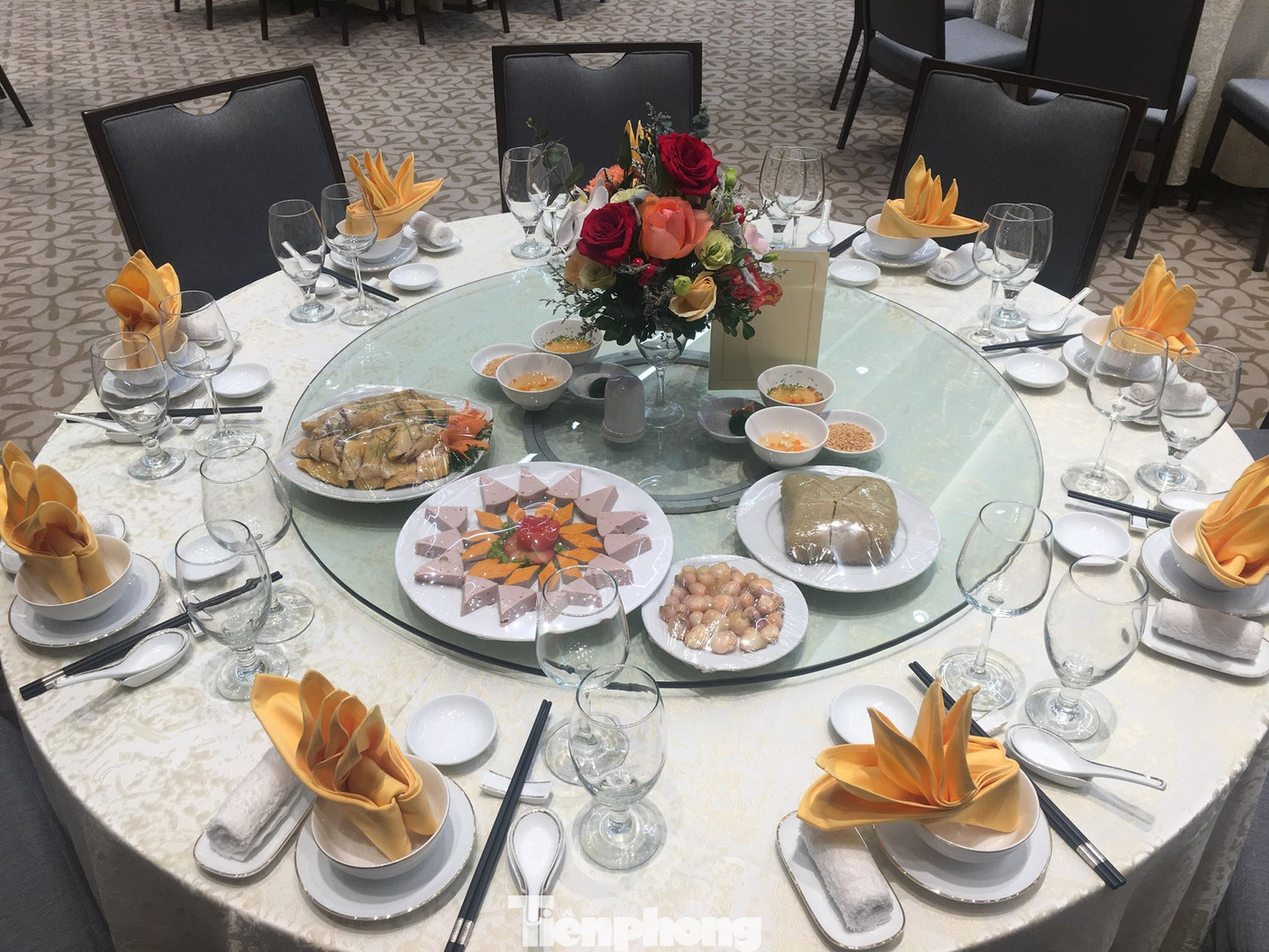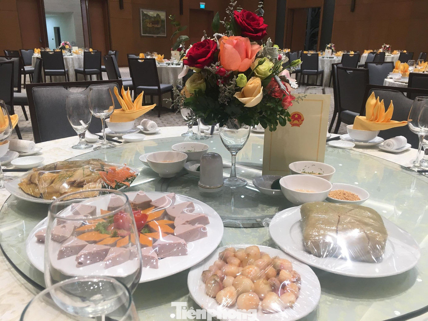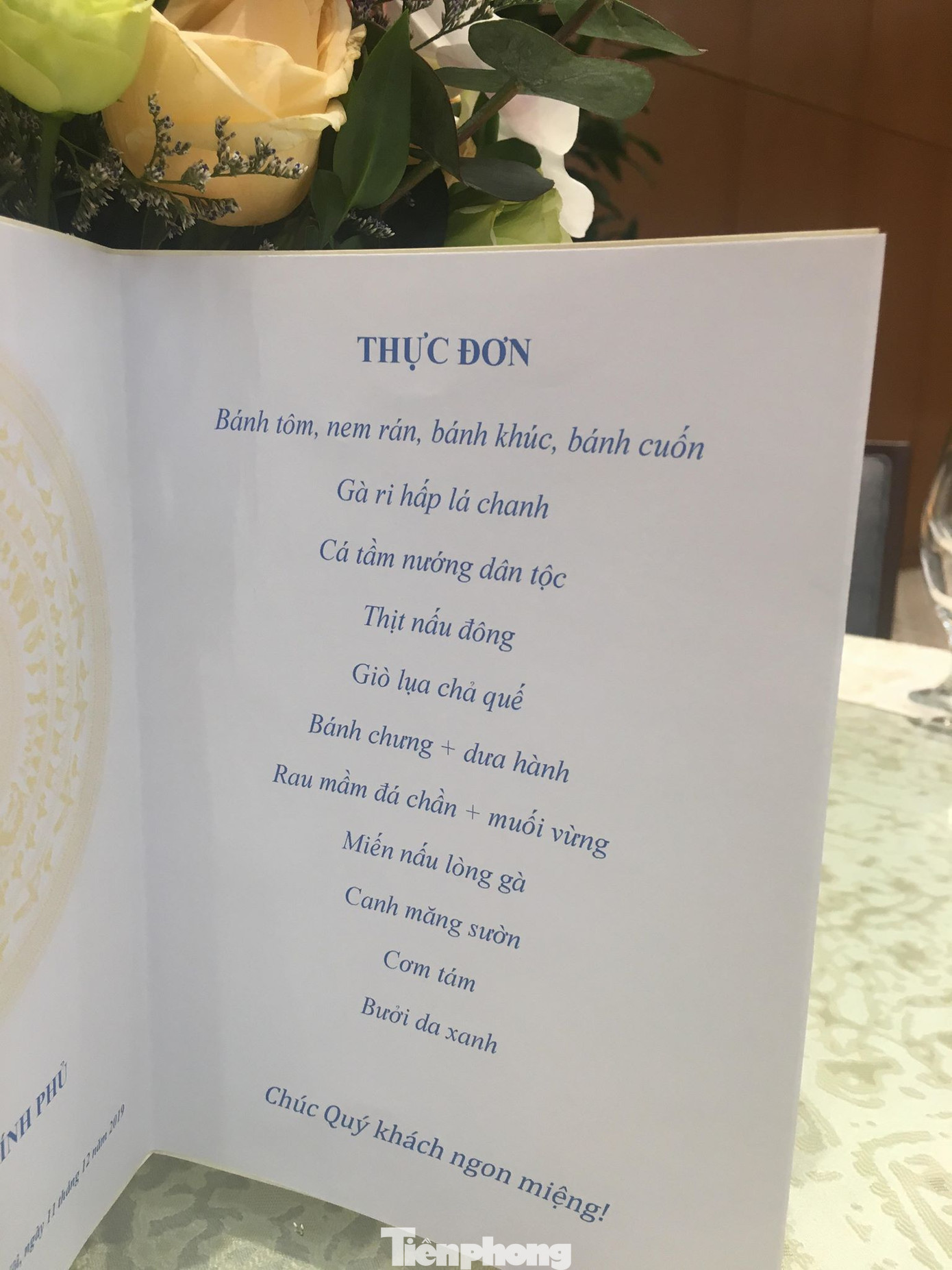 Thực đơn gồm những món ăn mang đậm chất quê hương và hương vị ngày Tết, gồm bánh tôm, nem rán, bánh khúc, bánh cuốn, gà ri hấp lá chanh, cá tầm nướng, thịt nấu đông, giò lụa, chả quế, bánh chưng và dưa hành.
