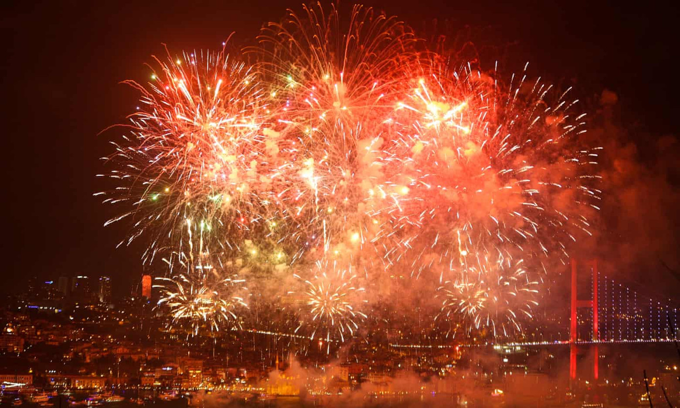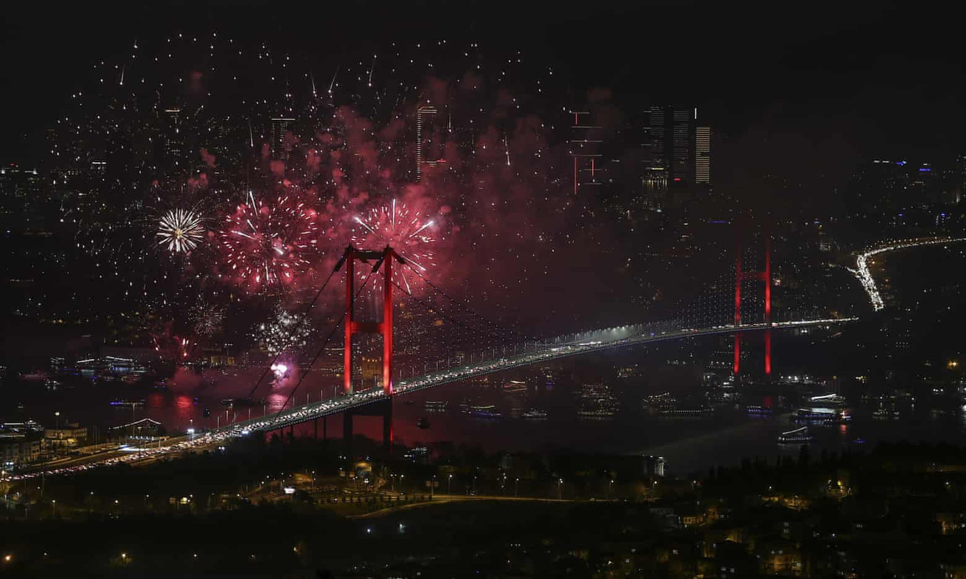 Pháo hoa thắp sáng cầu Bosphorus. Bosphorus là cây cầu treo ở Istanbul, Thổ Nhĩ Kỳ bắc qua eo biển Bosphorus, eo biển nằm giữa 2 lục địa Á-Âu. Ảnh: Getty