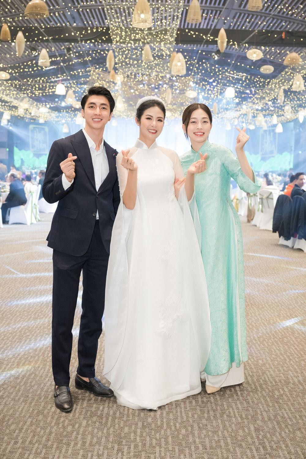 Ngọc Hân, Đỗ Mỹ Linh đọ sắc cùng Á hậu Hoàng Anh, diễn viên Lương Thanh. Có thể thấy các khách mời đều mặc áo dài truyền thống đúng như mong muốn của cô dâu Ngọc Hân, giúp đám cưới mang đậm phong cách truyền thống.