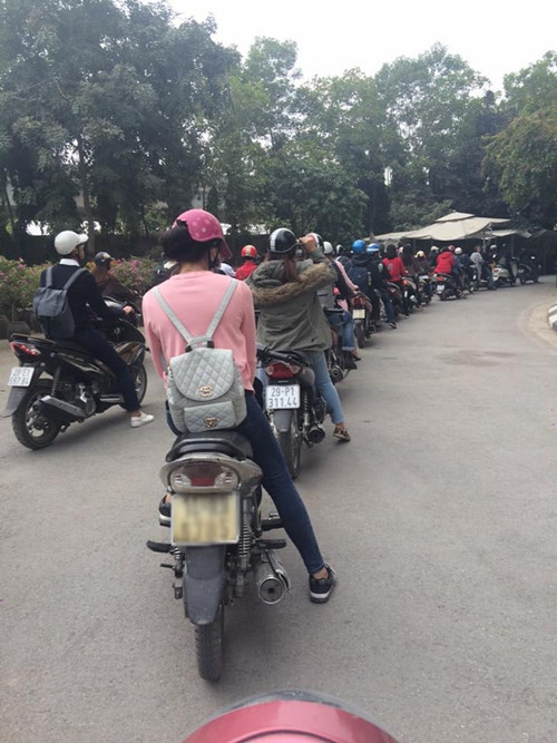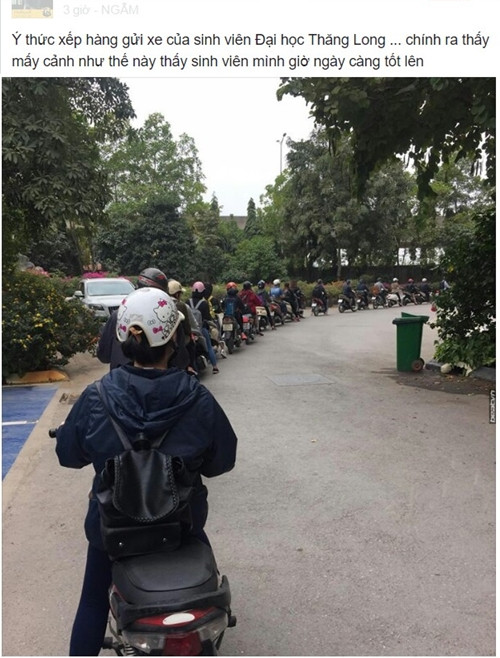 Bức ảnh ghi lại cảnh hàng chục sinh viên xếp hàng dài, nối đuôi nhau một cách trật tự, nghiêm túc được chia sẻ nhiều trên mạng xã hội. Khoảnh khắc này được ghi lại tại khu vực lối vào bãi giữ xe của ĐH Thăng Long (Hà Nội). Việc kiên nhẫn chờ đến lượt, không hề xảy ra tình trạng chen lấn khiến người xem tán thưởng về ý thức.