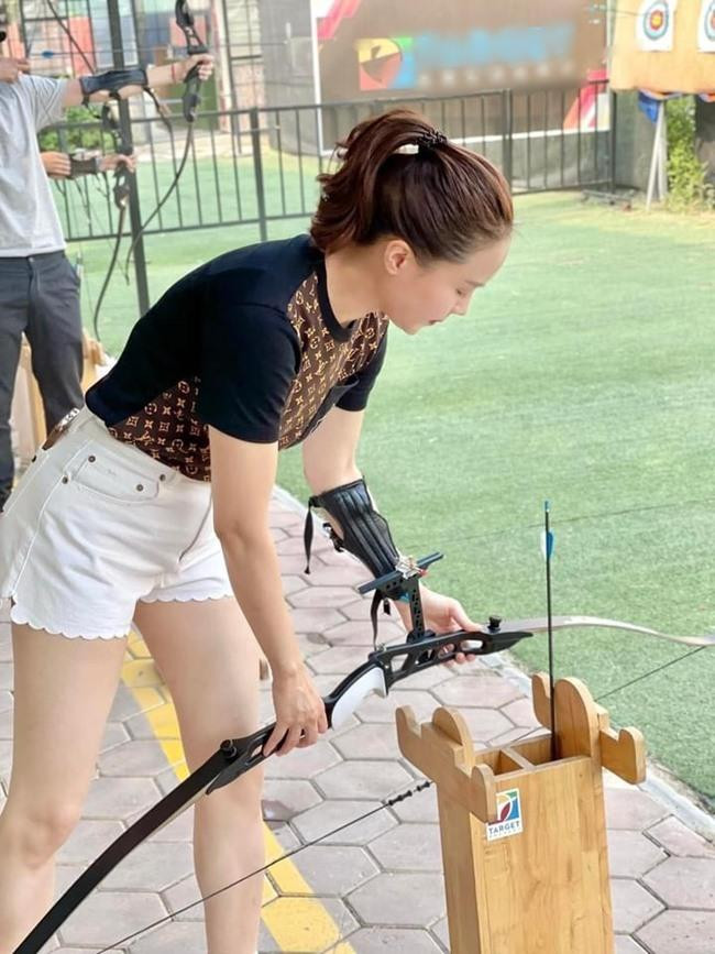 | Hồng Diễm khoe vẻ đẹp mạnh mẽ, khỏe khoắn khi tập trung bắn cung. - Ảnh: FBNV. |