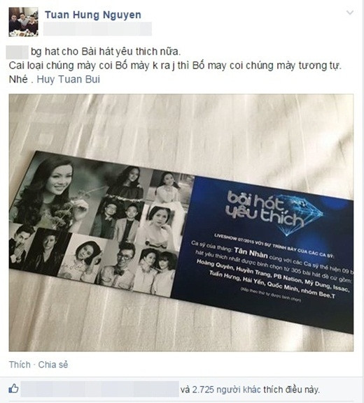 Không chỉ chia sẻ dòng trạng thái này, Tuấn Hưng còn 'tag' nhạc sĩ Huy Tuấn là giám đốc âm nhạc của chương trình Bài hát yêu thích. Tuy nhiên có lẽ do quá ngỡ ngàng với cách phản ứng của Tuấn Hưng nên nhạc sĩ Huy Tuấn vẫn chưa đưa ra phản hồi của mình trong các bình luận bên dưới status của Tuấn Hưng.