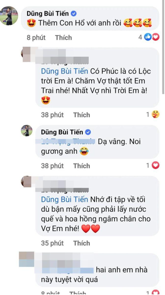 Mới đây, thủ môn Bùi Tiến Dũng úp mở chuyện bà xã là người mẫu Tây đang mang thai con trai đầu lòng. Theo đó, Bùi Tiến Dũng để lại bình luận bên dưới dòng trạng thái của một người anh thân thiết: “Thêm hổ con với anh rồi”.
