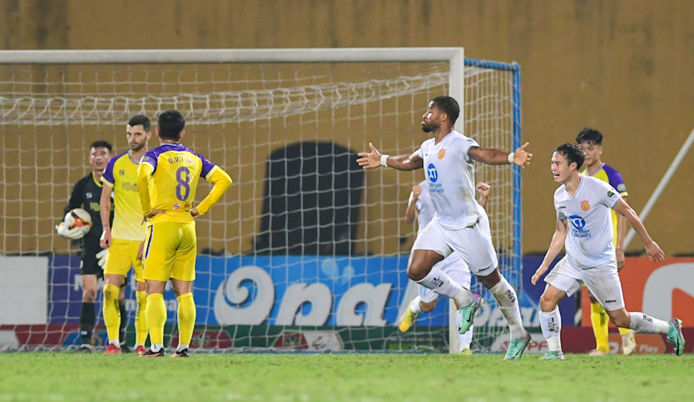 Nhưng Nam Định là những người khởi đầu tốt hơn. Phút 16, đội bóng thành Nam mở điểm. Tận dụng pha mất bóng bên phần sân nhà của đối thủ, Hendrio kiến tạo cho Rafaelson dứt điểm. Bóng đi căng, lại nhắm về góc cao nên thủ môn Văn Chuẩn không thể cản phá.