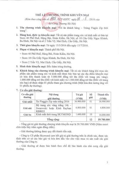 Chương trình áp dụng đối với toàn bộ khách hàng mua trang sức và kính mắt tại hệ thống Skymond Luxury và kết thúc vào ngày 15/7. Hoạt động bốc thăm trúng thưởng sẽ được tổ chức vào lúc 16h00 ngày 16/7 tại store số 18 Cầu Giấy – Ngọc Khánh – Ba Đình – Hà Nội.