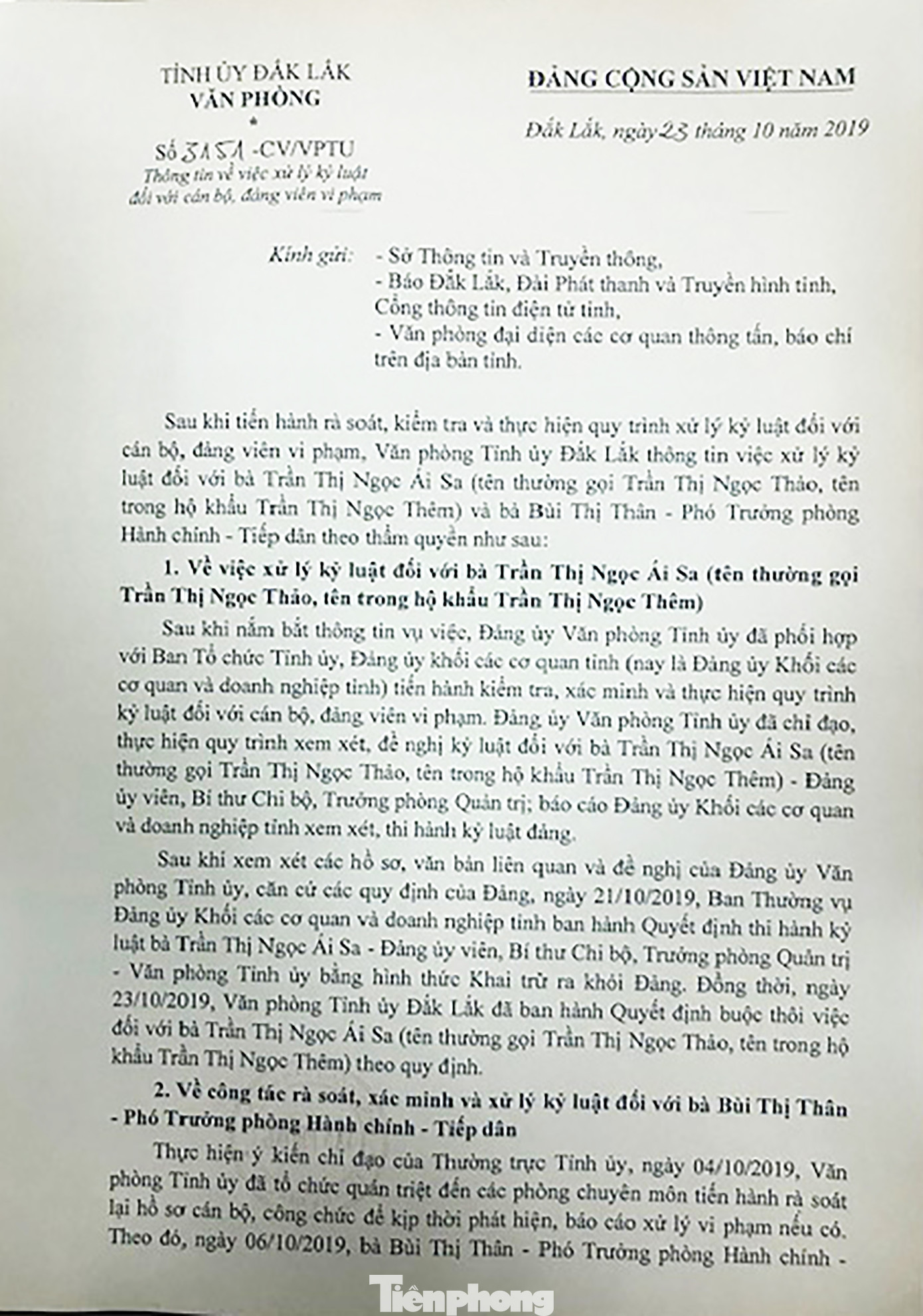 Căn cứ đề nghị của Đảng ủy VPTU, ngày 21/10/2019 Ban thường vụ Đảng ủy Khối các cơ quan và doanh nghiệp tỉnh đã “ban hành Quyết định thi hành kỷ luật bà Trần Thị Ngọc Ái Sa- Đảng ủy viên, Bí thư chi bộ, Trưởng phòng Quản trị-Văn phòng Tỉnh ủy bằng hình thức khai trừ ra khỏi Đảng. Đồng thời, ngày 23/10/2019, VPTU Đắk Lắk đã ban hành Quyết định buộc thôi việc đối với bà Trần Thị Ngọc Ái Sa”.