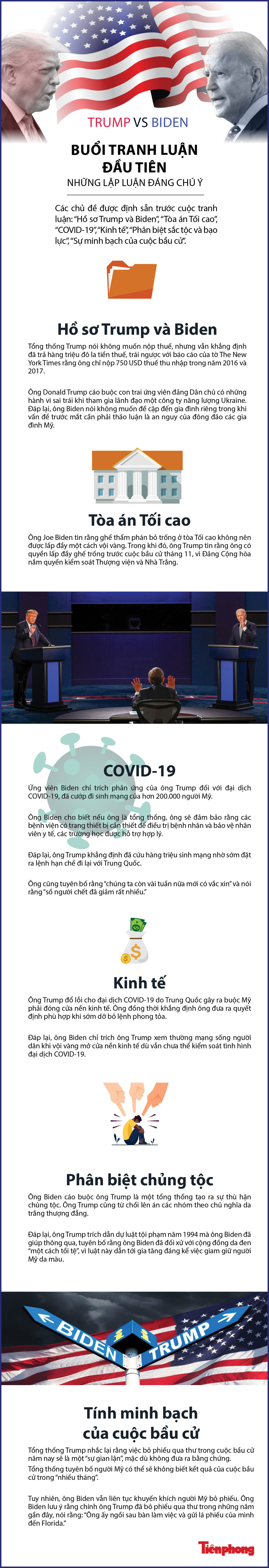 TPO - Các chủ đề được định sẵn trước cuộc tranh luận: “Hồ sơ Trump và Biden”, “Tòa án Tối cao”, “COVID-19”, “Kinh tế”, “Phân biệt sắc tộc và bạo lực”, “Sự minh bạch của cuộc bầu cử”.