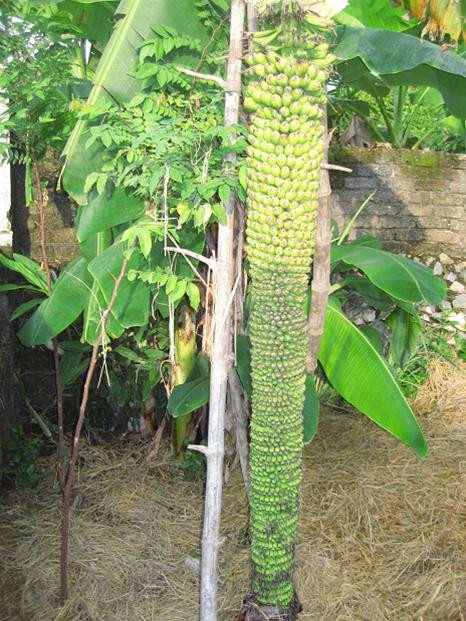 Đây là cây thứ ba có hiện tượng như trên. Trong khi buồng chuối tiếp tục ra quả thì nải trên cùng đã bắt đầu chín còn phần dưới đã giáp đất.