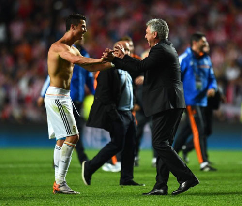 C. Ronaldo ăn mừng cùng HLV Ancelotti sau trận đấu.
