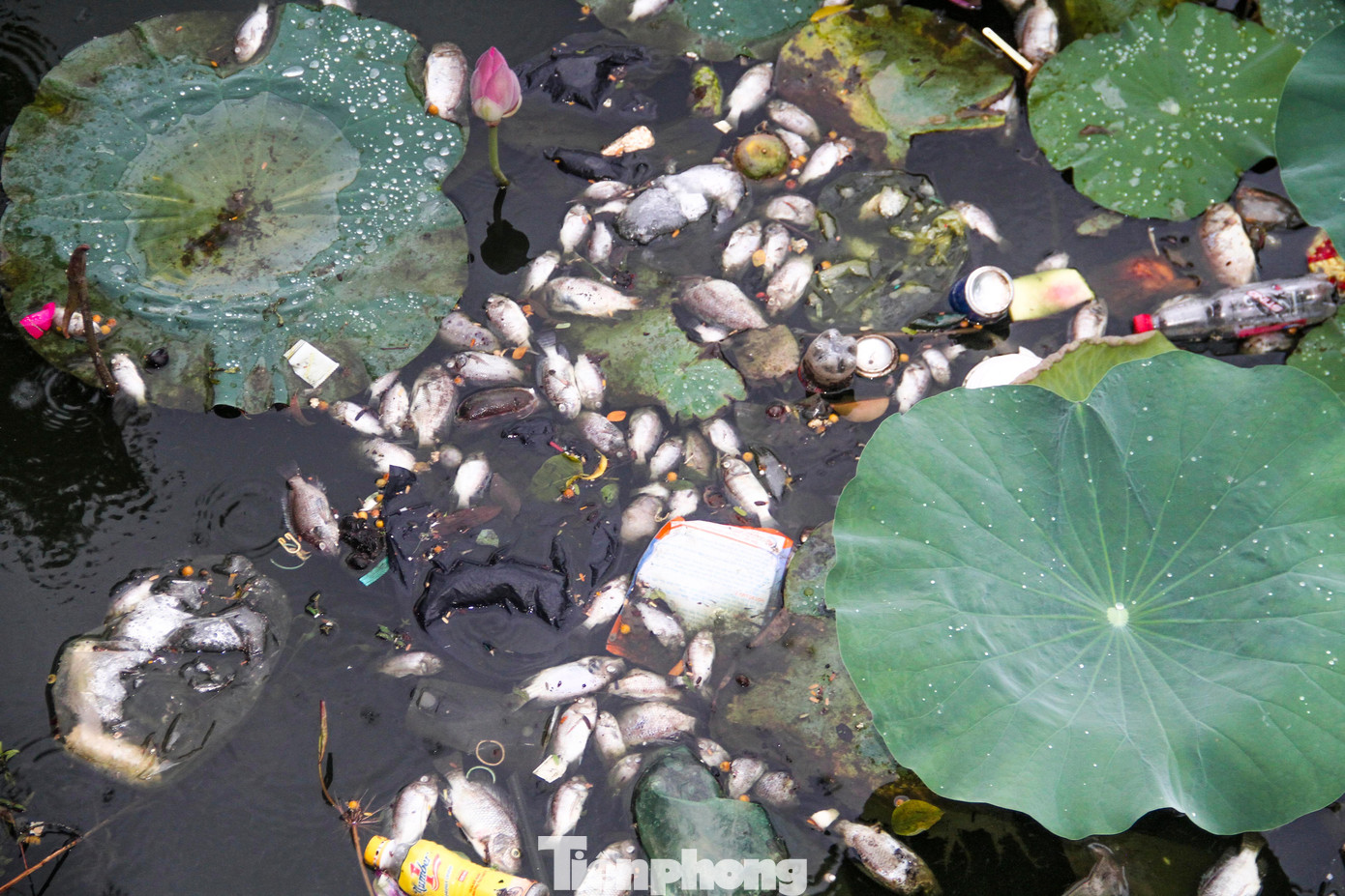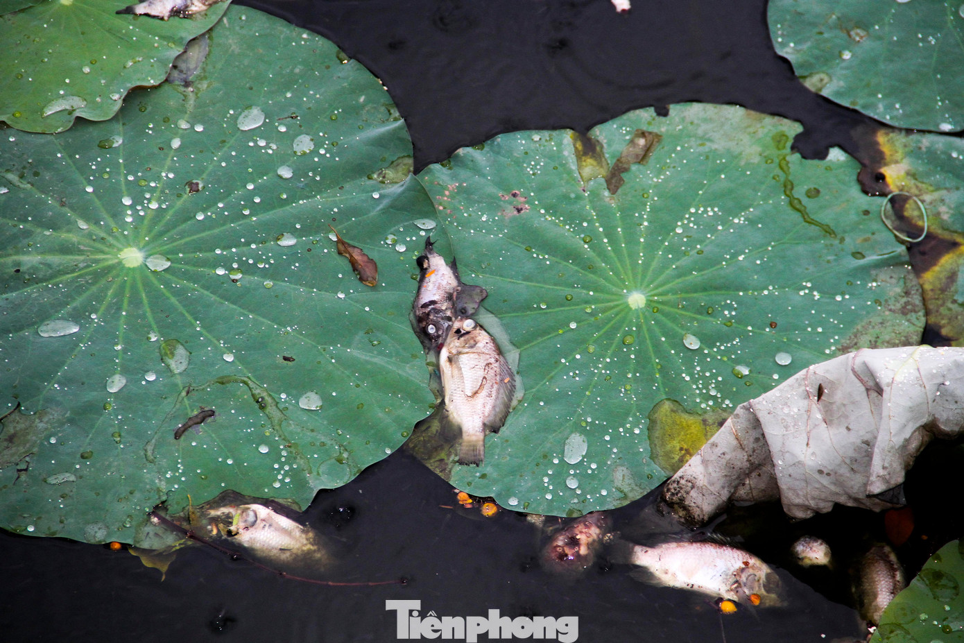 | Cá chết rất nhiều, tập trung chủ yếu khu vực có sen. Ảnh: Trương Định |