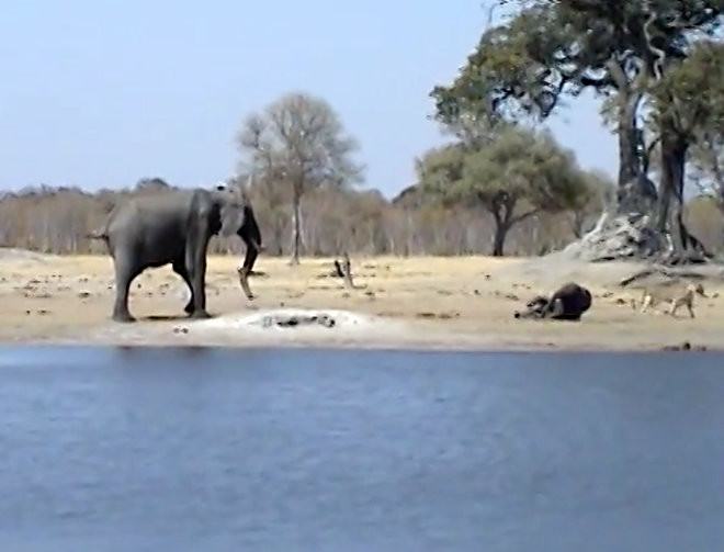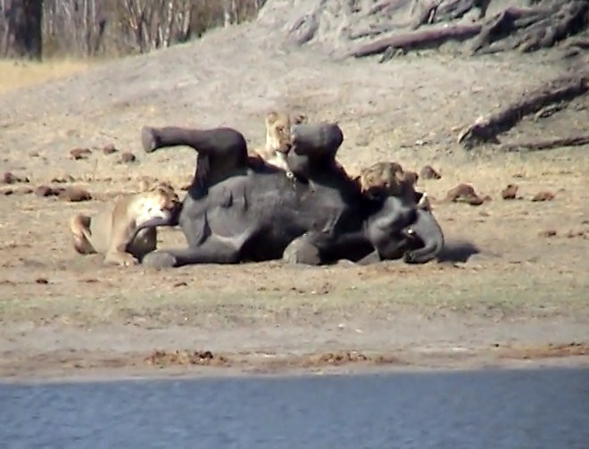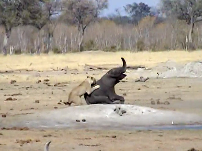Theo Latest Sighting, cảnh tượng voi con chết thảm vì dám tấn công sư tử này do anh Hennie Bekker tình cờ ghi lại được khi đang tham quan Vườn quốc gia Hwange ở Zimbabwe.