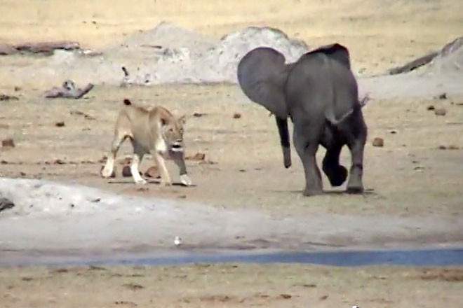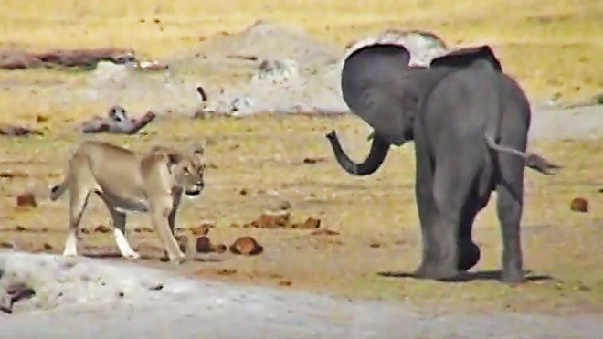 Chính điều này khiến chú voi này có cuộc chạm trán không mong muốn với con sư tử cái. Điều đáng nói ở đây là, thay vì bỏ chạy ngay lập tức, nó còn lao lên tấn công kẻ săn mồi.