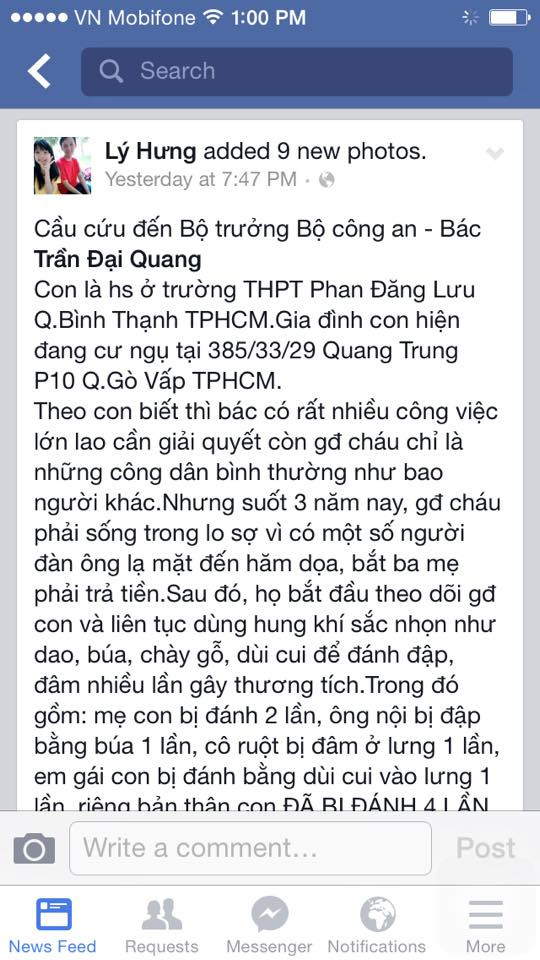 Bí bách, mới đây Lý Hưng đã viết lên facebook để trình bày về nỗi lo sợ của gia đình và cầu cứu tới Bộ trưởng Bộ Công an Trần Đại Quang.