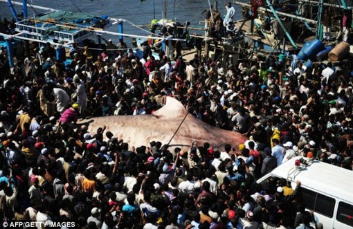 Chùm ảnh đông đảo người dân đến tụ tập xem vớt xác cá mập voi khổng lồ: