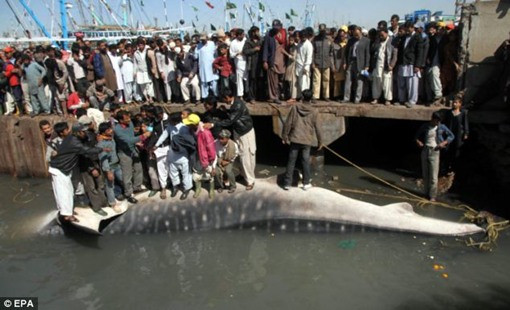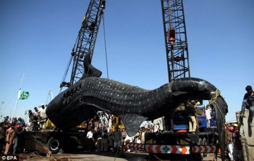 Con cá mập voi “khủng” này được kéo vào cảng cá ở Karachi sau khi được phát hiện đã chết cách đây 10 ngày ở vùng biển Ả Rập, cách bờ biển khoảng 90 dặm.