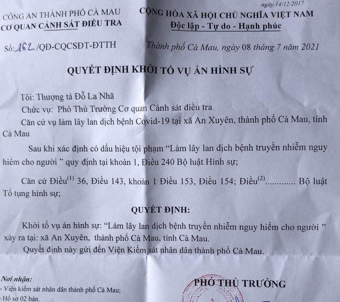 Ngày 8/7, thượng tá Đỗ La Nhã, Phó thủ trưởng Cơ quan CSĐT Công an thành phố Cà Mau (Cà Mau) cho biết, CQĐT đã khởi tố vụ án “Làm lây lan dịch bệnh truyền nhiễm nguy hiểm cho người” xảy ra tại xã An Xuyên (thành phố Cà Mau).