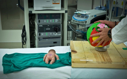 Nó được bơm căng như một quả bóng bằng khí CO2, sau đó bác sĩ dùng thiết bị nội soi gây mê và phẫu thuật cho em bé bên trong qua 2 lỗ rất nhỏ.
