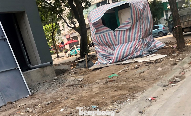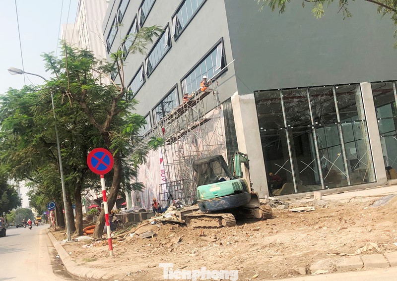 Ngoài vỉa hè mặt tiếp giáp với đường Trần Thủ Độ, vỉa hè 4 xung quanh tòa nhà tòa nhà Mitsubishi Việt Hồng - Hoàng Mai nằm trên các tuyến phố khác cũng đang bị đào xới toàn bộ lớp gạch, mặt bằng nhếch nhác.