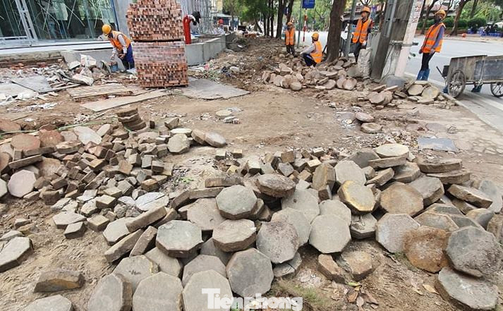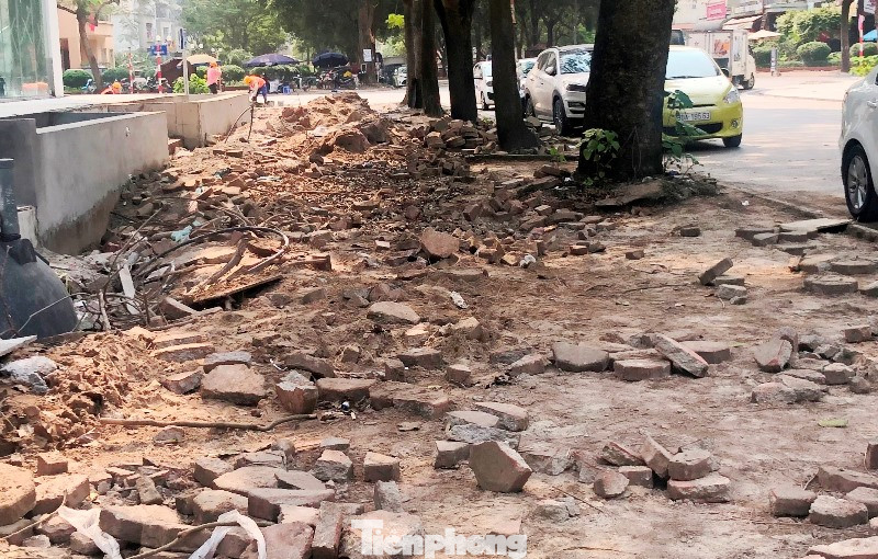 Ngoài bóc toàn bộ nền mặt vỉa hè lát gạch hình lục giác màu đỏ mang đi nơi khác đổ, đơn vị thi công ở đây còn tiến hành đào xới nền vỉa hè lên.