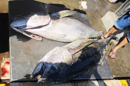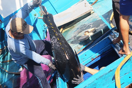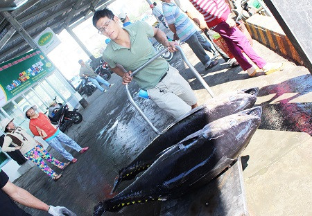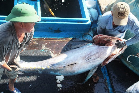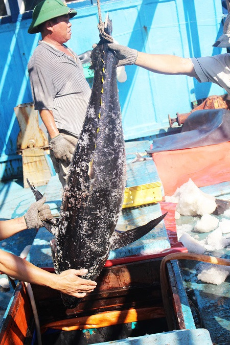 Mỗi con cá ngừ đại dương ở Trường Sa có thể nặng tới 65kg, với giá bán tại cảng Hòn Rớ (TP Nha Trang) dao động 93.000-95.000 đồng/kg.