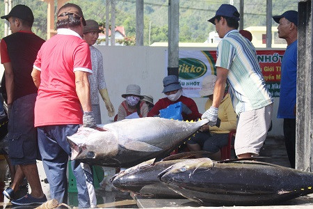 Hoạt động mua bán cá ngừ đại dương ở Cảng Hòn Rớ (TP Nha Trang) diễn ra nhộn nhịp từ mờ sáng đến trưa cùng ngày. Việc ngư dân trúng đậm cá ngừ đại dương sẽ tạo công ăn việc làm cho hàng trăm người dân địa phương ở cảng cá này.