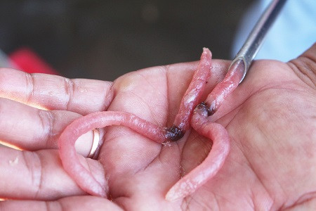 Thương lái thử thịt cá ngừ đại dương tại bến cảng. Nếu thịt cá tươi, đỏ, quyện đặc... thì đảm bảo chất lượng, giá cả ổn định