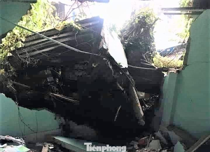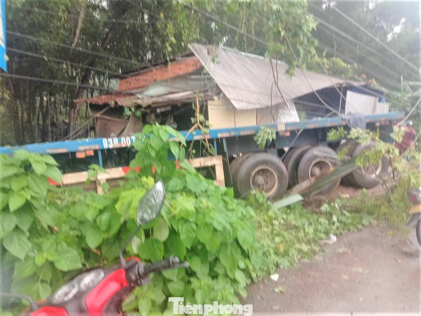 Tại hiện trường, trụ đèn đổ nằm bên đường, một phần cabin xe container nằm bên trong nhà. Vụ tai nạn khiến một phần tường nhà bị đổ sập, cây xanh và trụ điện bên đường gãy ngổn ngang.