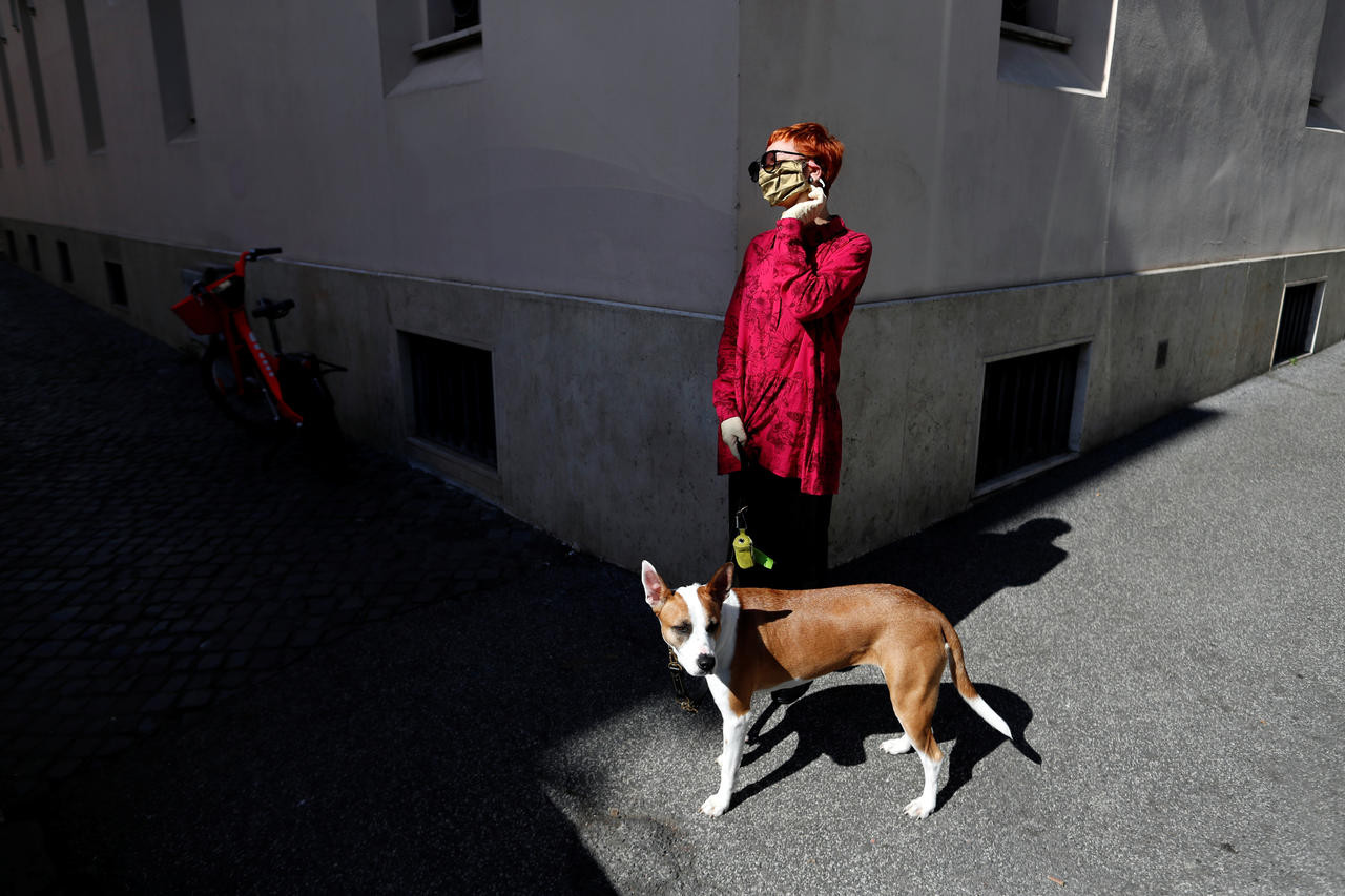 Một phụ nữ dẫn chó đi dạo tại Roma ngày 16/3/2020