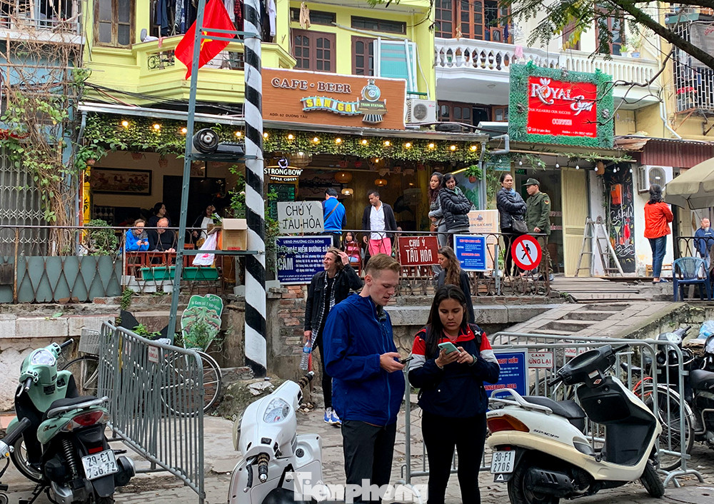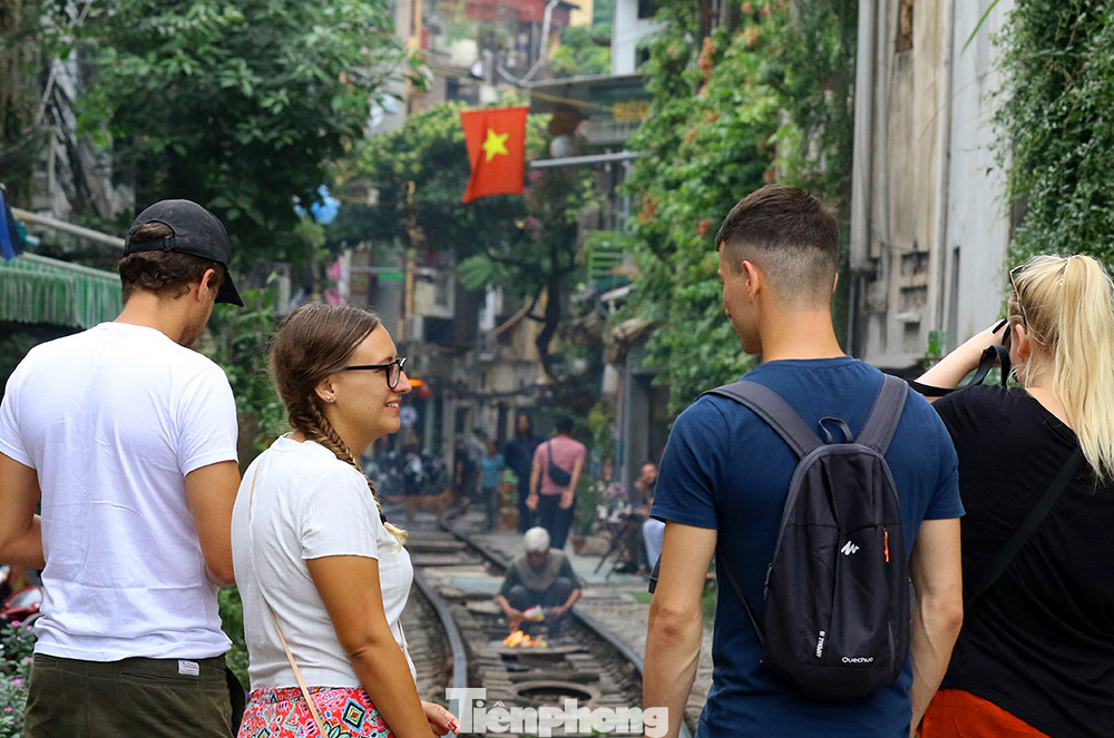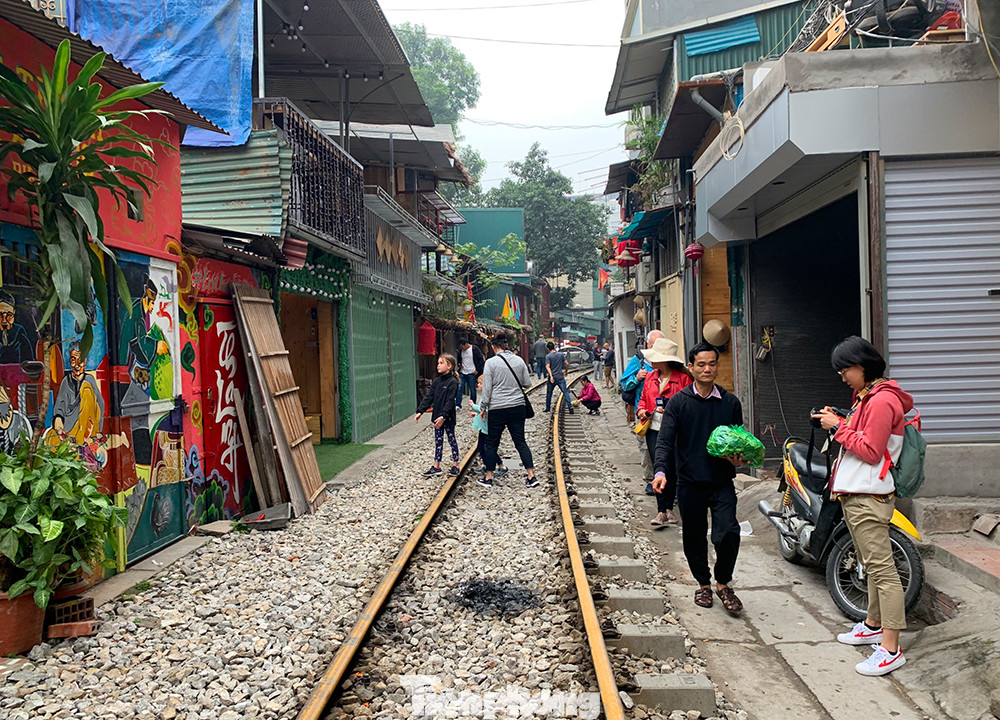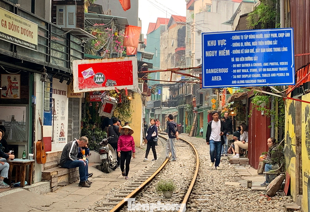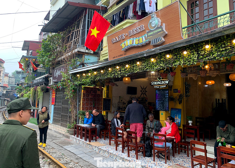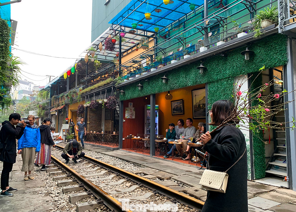 Dọc đoạn đường tàu khoảng vài trăm mét, nhộn nhịp cảnh tượng khách du lịch đi lại, chụp ảnh trên đường ray, ngồi uống cà phê bên đường sắt để… đợi tàu chạy qua