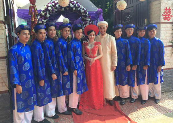 Chú rể tương lai được đông đảo bạn bè tới phụ giúp bưng tráp lễ vật. Mọi người đều mừng anh nên duyên vợ chồng với nữ diễn viên xinh đẹp.
