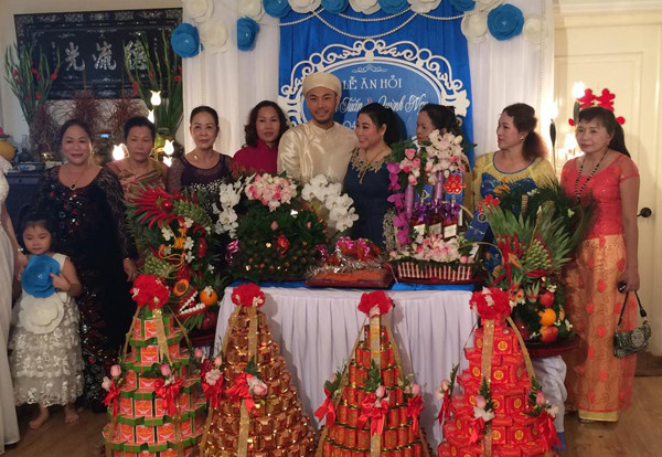 Anh và gia đình chuẩn bị lễ vật đầy đủ với các loại bánh kẹo, trầu, cau, trái cây được trang trí công phu, đẹp mắt.