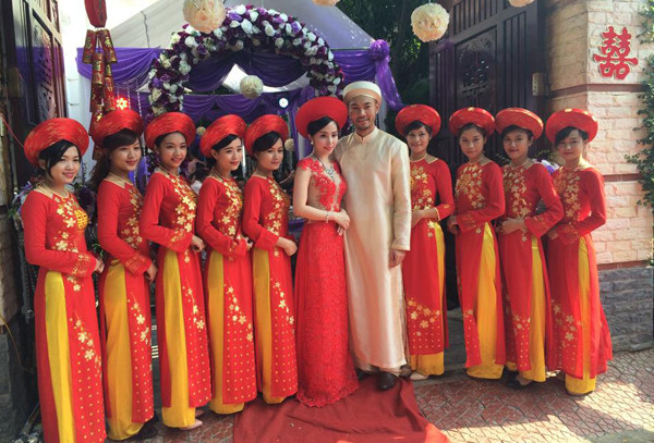 ... và các cô gái nhận tráp của nhà gái rực rỡ với áo dài đỏ.