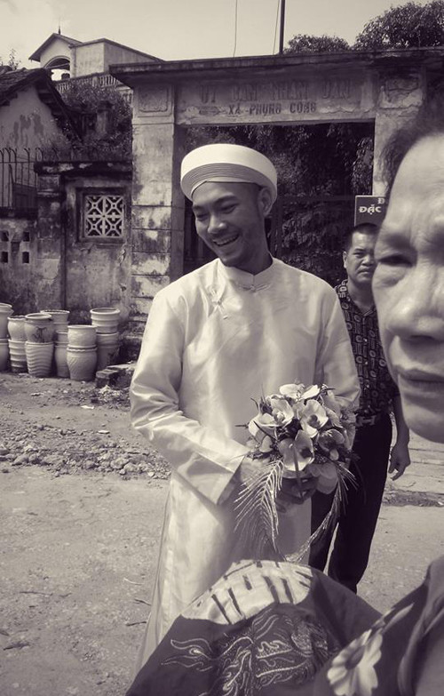 Người mẫu Doãn Tuấn mặc áo dài, khăn đóng truyền thống, rạng rỡ niềm vui trước giờ xuất phát lên đường đi hỏi vợ.