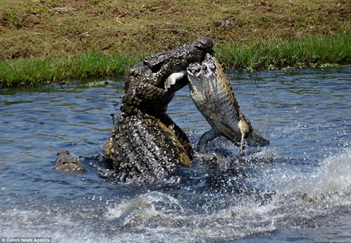 Con cá sấu trưởng thành "tóm" được một đồng loại nhỏ hơn và ngay lập tức tấn công, biến nó thành bữa ăn của mình.