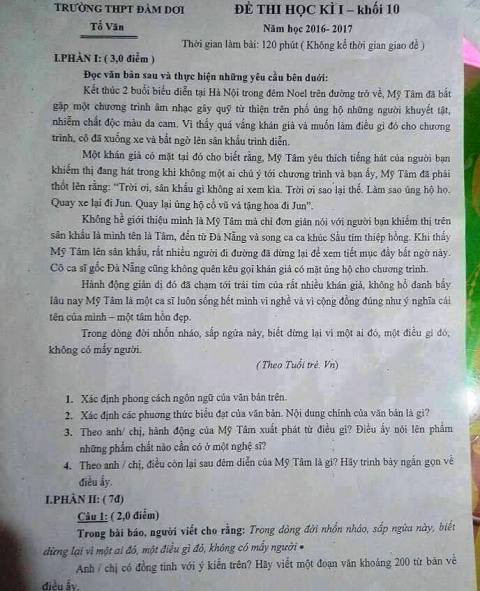 Theo đó, tại câu hỏi thứ ba của phần 1 đề thi, giáo viên yêu cầu học sinh cho biết: "Hành động của Mỹ Tâm xuất phát từ điều gì? Điều đó nói lên phẩm chất nào cần có ở một nghệ sĩ?". Cuối câu hỏi của phần này yêu cầu học sinh "trình bày ngắn gọn về ý nghĩa của điều còn lại sau đêm diễn của cô ca sĩ".
