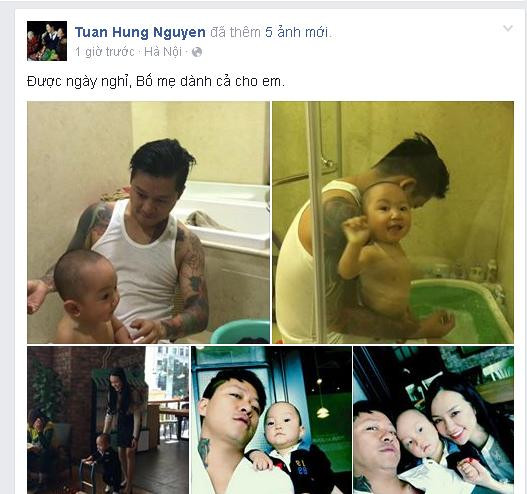 Trên trang cá nhân, Tuấn Hưng đăng tải một số khoảnh khắc đời thường của anh bên gia đình với dòng chú thích: "Được ngày nghỉ, bố mẹ dành cả cho em”. Ông bố trẻ còn tự tay cạo tóc và tắm cho bé Su Hào.