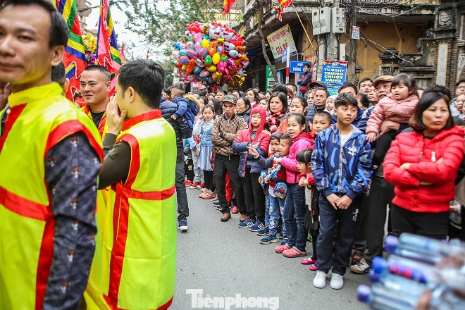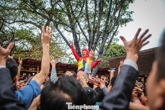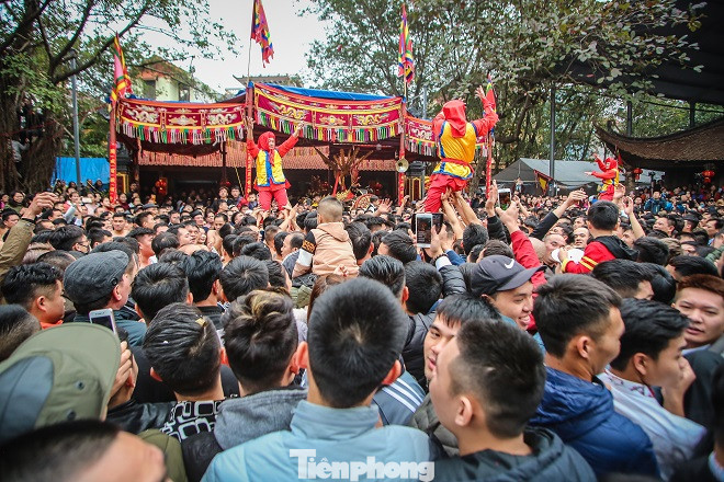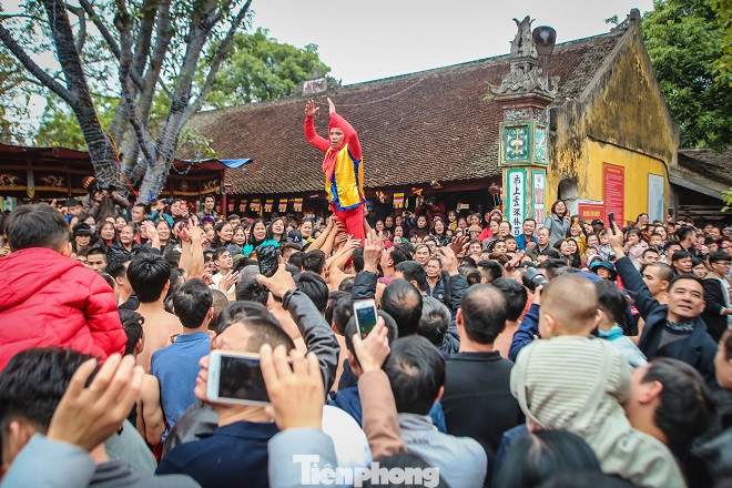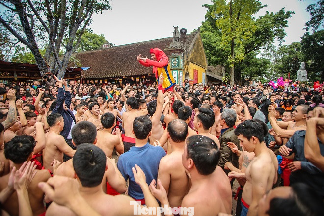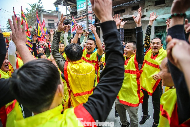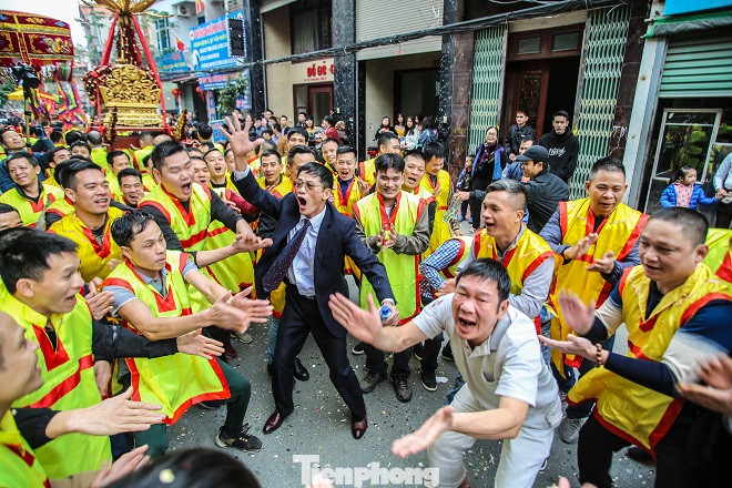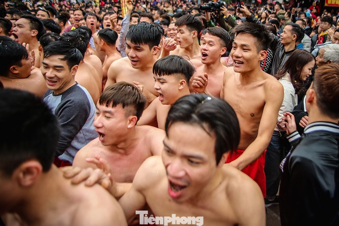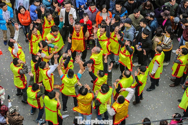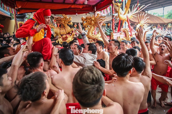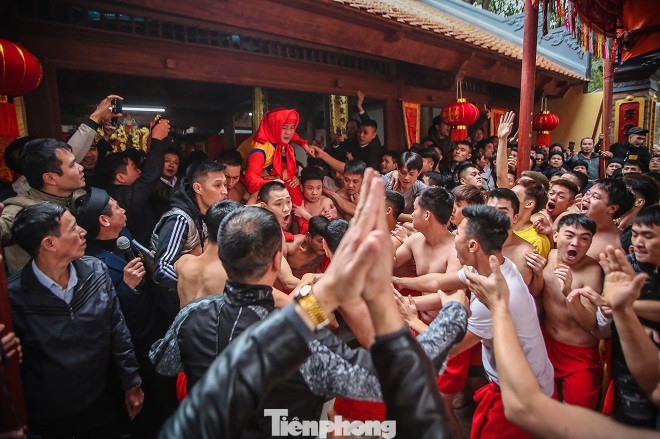 Sau màn rước pháo, hàng trăm trai tráng Đồng Kỵ cởi trần bất chấp thời tiết lạnh buốt, nhảy, hò reo vào rước ông đám.