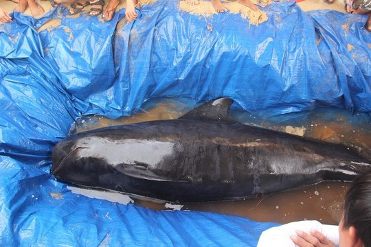 Trước đó, chiều 23/7, một số người dân phát hiện cá voi dài khoảng 3,2 m, nặng hơn 300 kg đang mắc cạn gần bờ biển. Mặc dù được người dân nhiều lần dùng ghe dẫn ra khơi, nhưng con cá tiếp tục quay vào bờ.