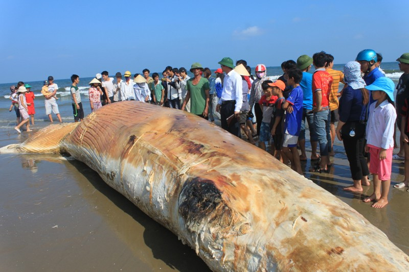 TPO - Xác một cá thể voi xám dài hơn 15m, nặng hơn ba tấn trôi dạt vào bãi biển ở thôn 1 (xã Hải An, huyện Tĩnh Gia, Thanh Hóa) vào trưa 1/11, thu hút người dân nhiều nơi đến xem.