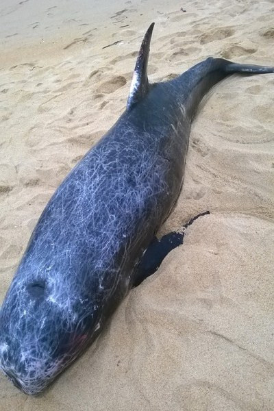 Cá voi có chiều dài 2,2m, nặng khoảng 250kg, lưng màu đen, bụng trắng. Theo quan điểm của người dân vùng ven biển, khi có cá voi lụy bờ sẽ báo hiệu một mùa biển nhiều may mắn.